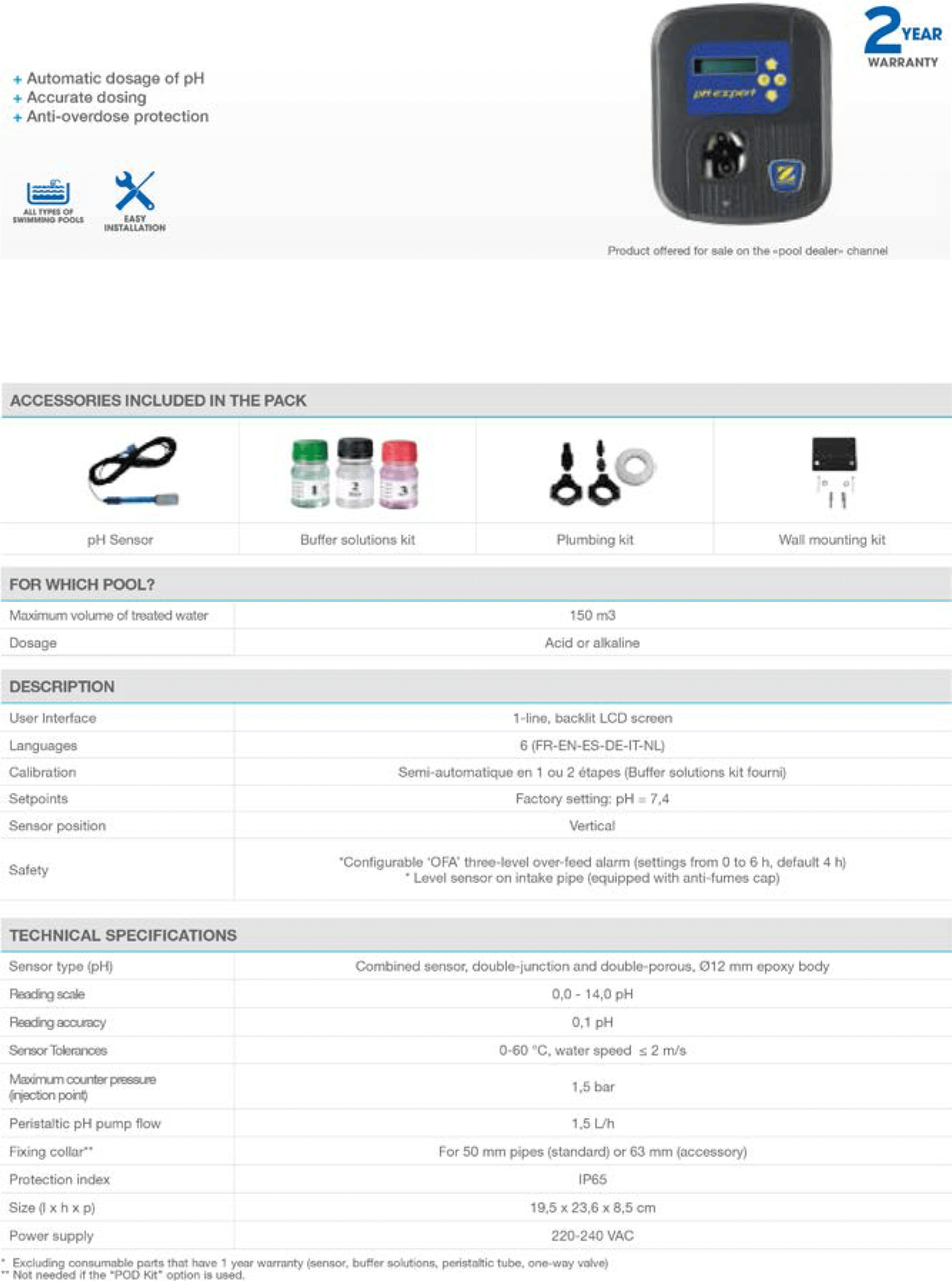 pH Expert includes Automatic dosing technology to maintain the ideal water balance in the pool, 100% automatic. Dosing time is adjusted depending on the difference between swimming pool pH and ideal pH. With its unique suction tube, pH corrector dosing is completely safe.